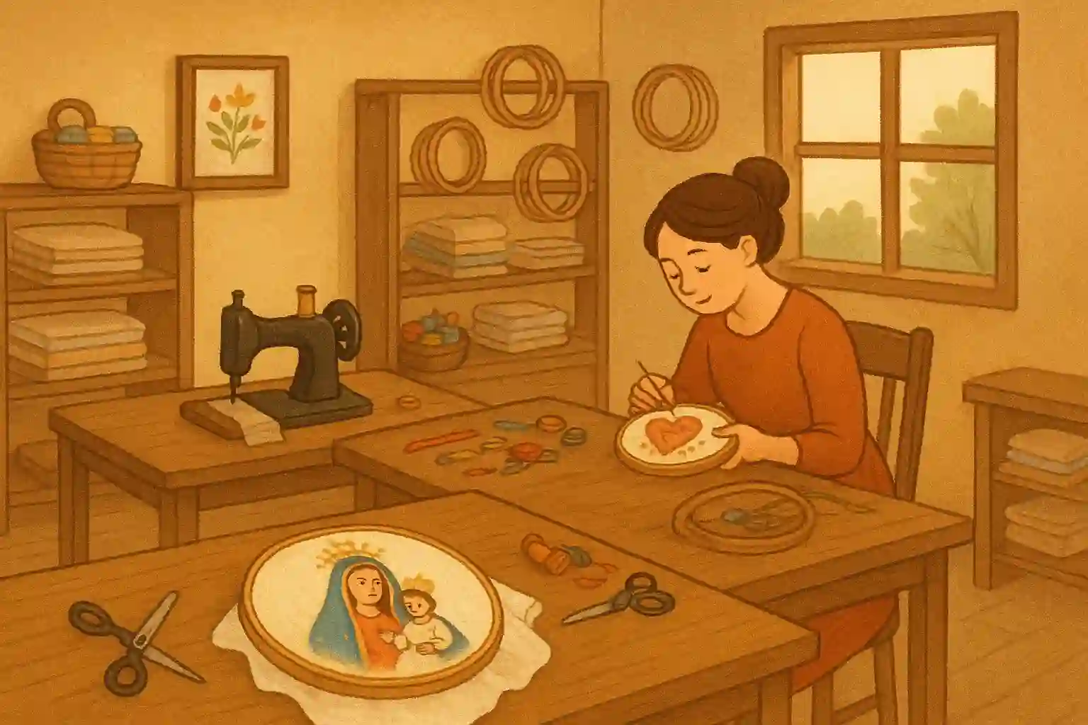 Somos un taller artesanal dedicado a confeccionar vestimentas y ornamentos litúrgicos bordados, elaborados con telas finas, hilos dorados y motivos sagrados.